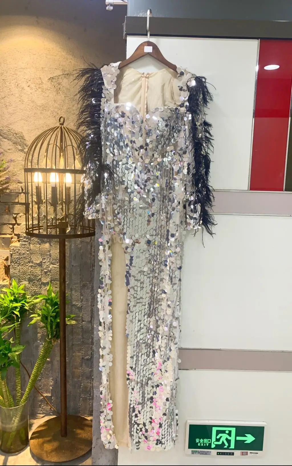 Women Luxury Sexy Long Sleeve Mesh Sequins Glitter Feather Maxi Long Bodycon Dress 2022 Designer Evening Party Dress Vestido Dresses Aliexpress