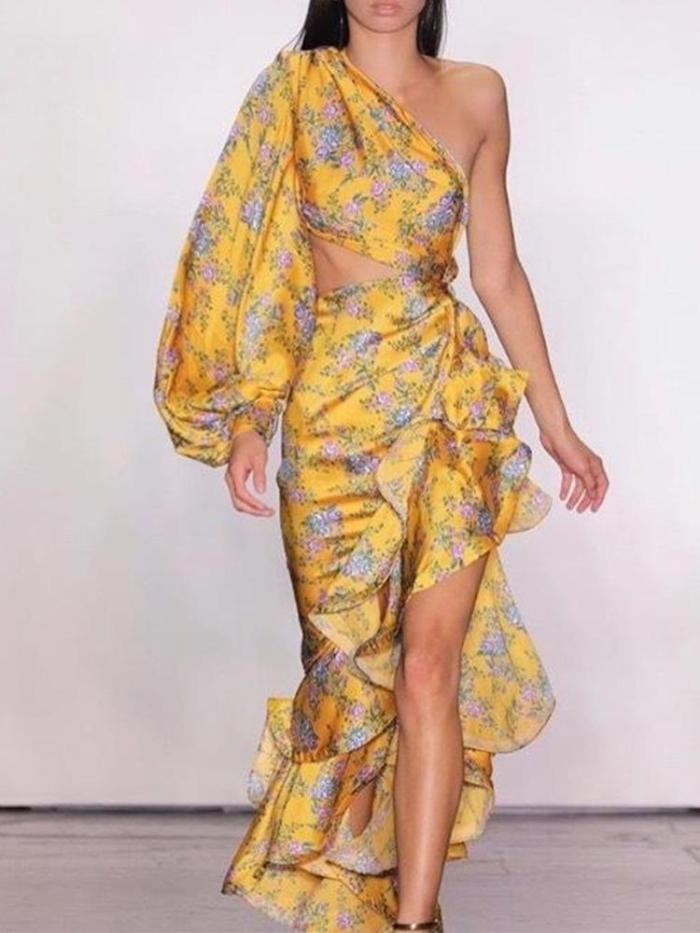 Us 49 88 Sexy Oblique Shoulder Single Sleeve Irregular Lotus Margin Evening Dresses Www Joymanmall Com